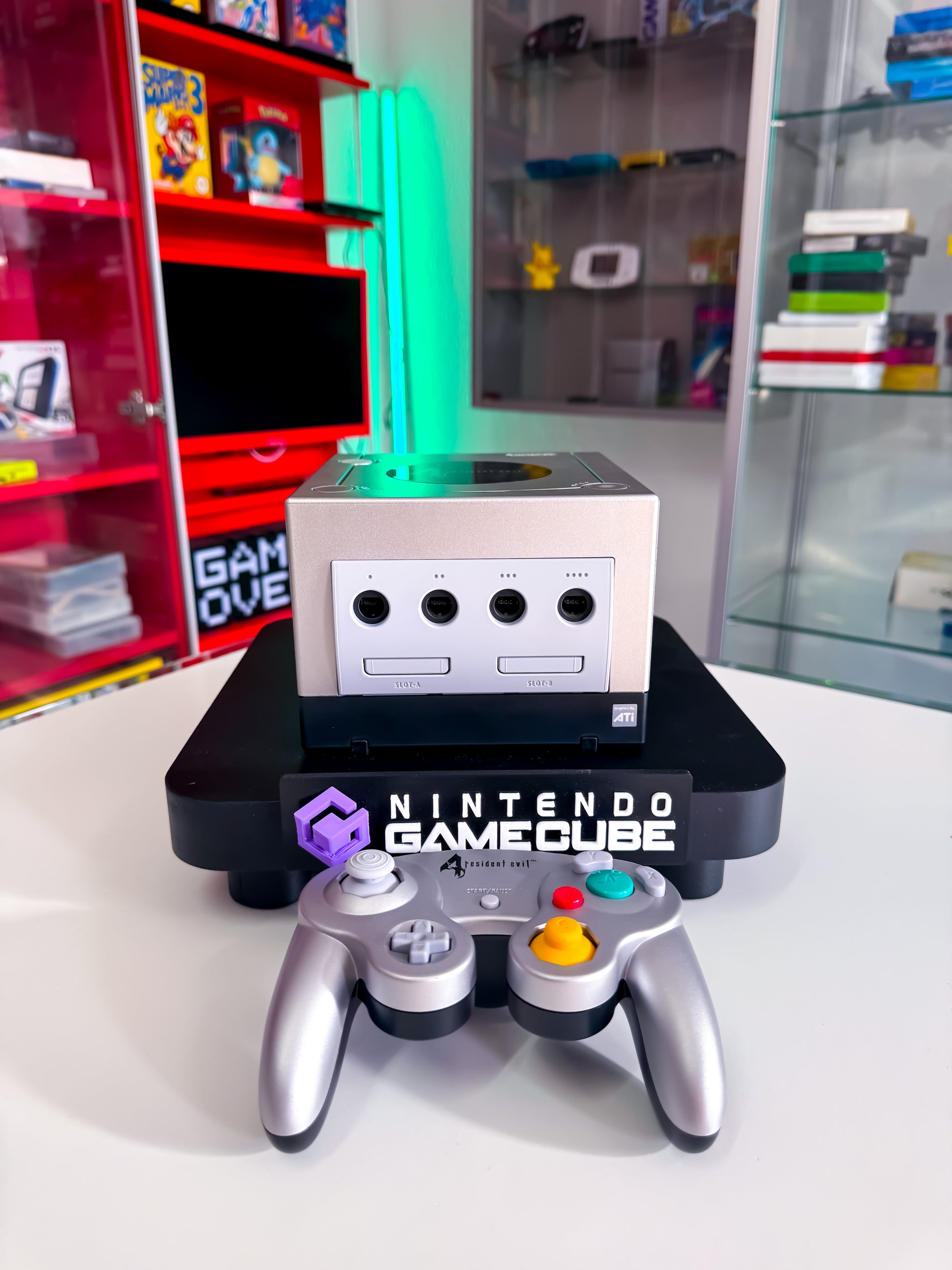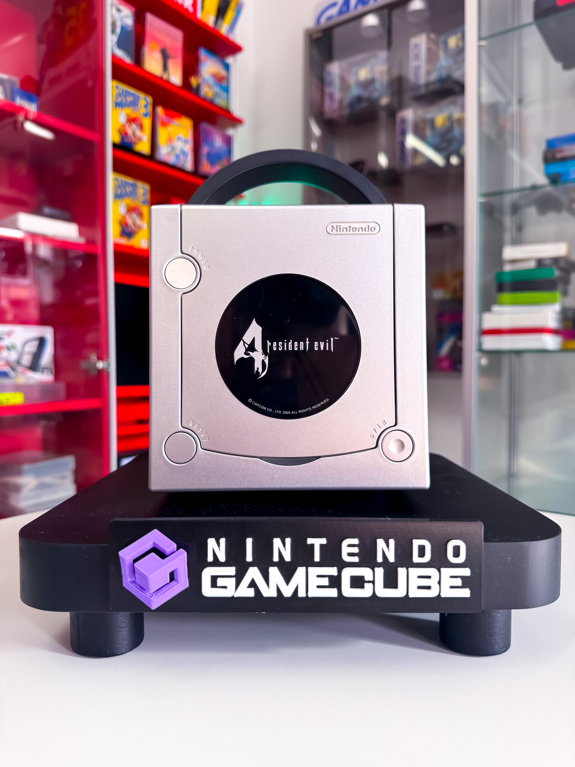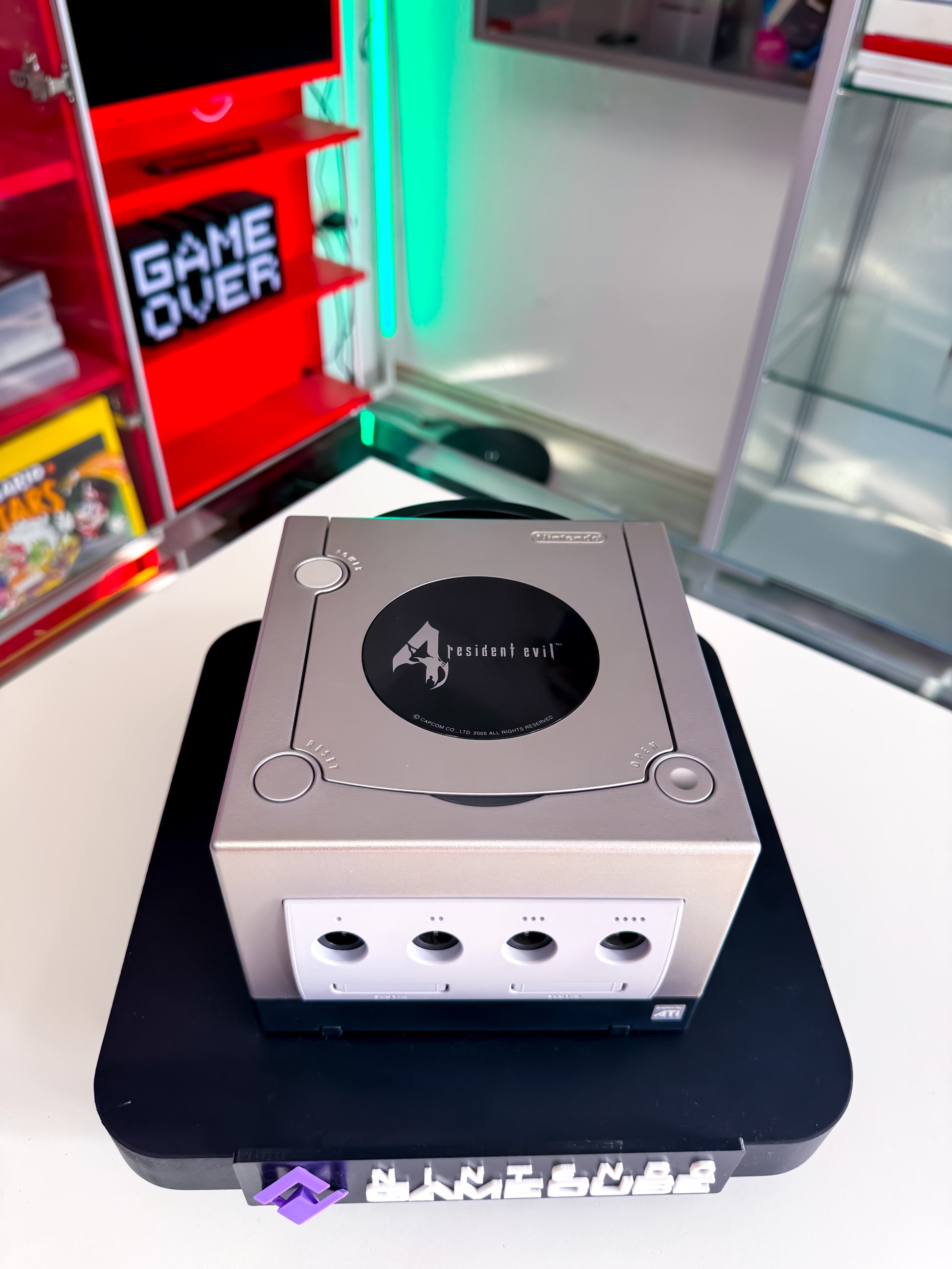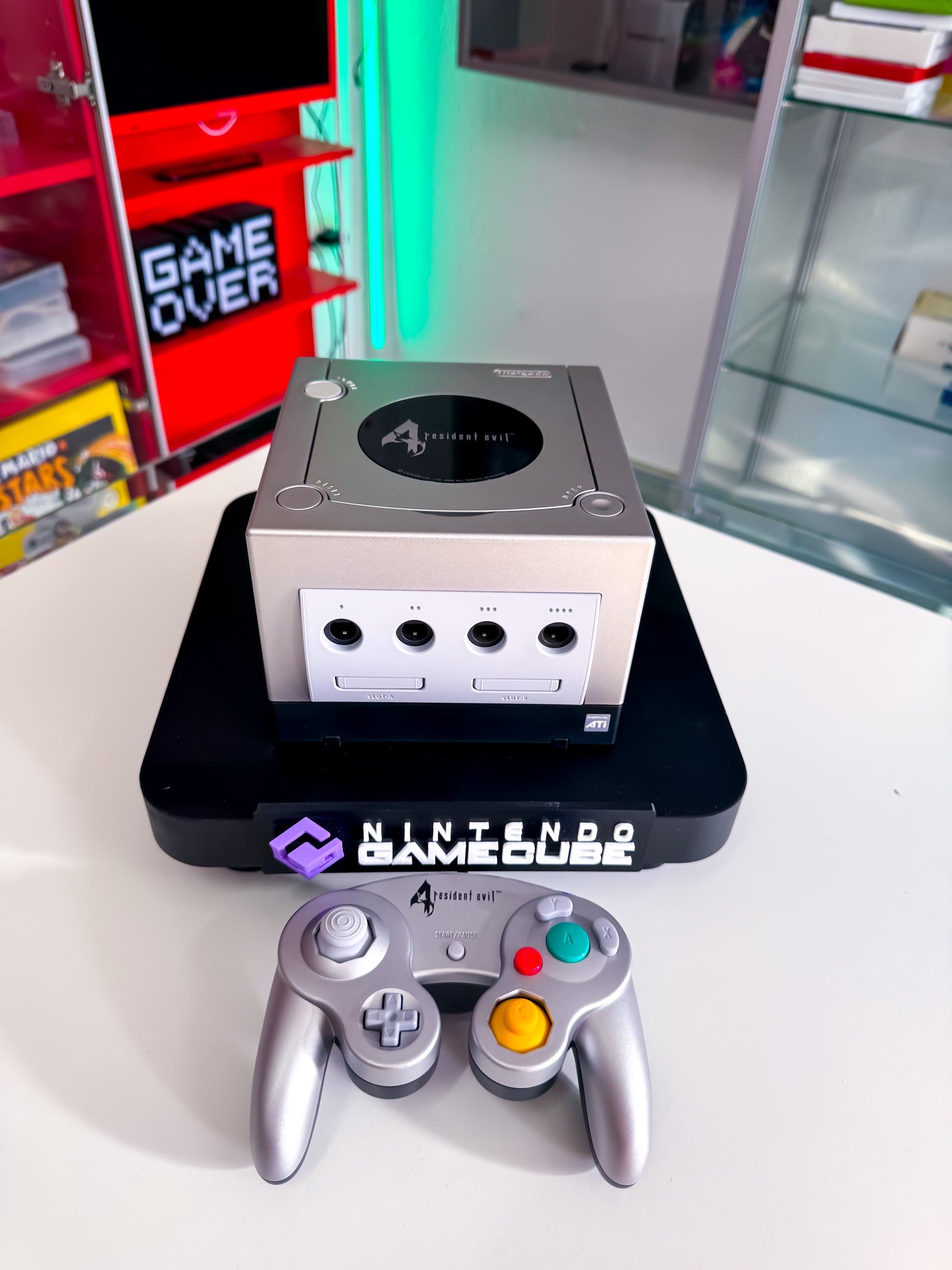 Stylische Limited Edition der Nintendo GameCube in edlem Silber-Schwarz mit Resident Evil 4 Branding. Ein Muss für Sammler und Fans der legendären Horror-Reihe – inklusive passendem Controller und exklusivem Look. 🧟♂️🎮