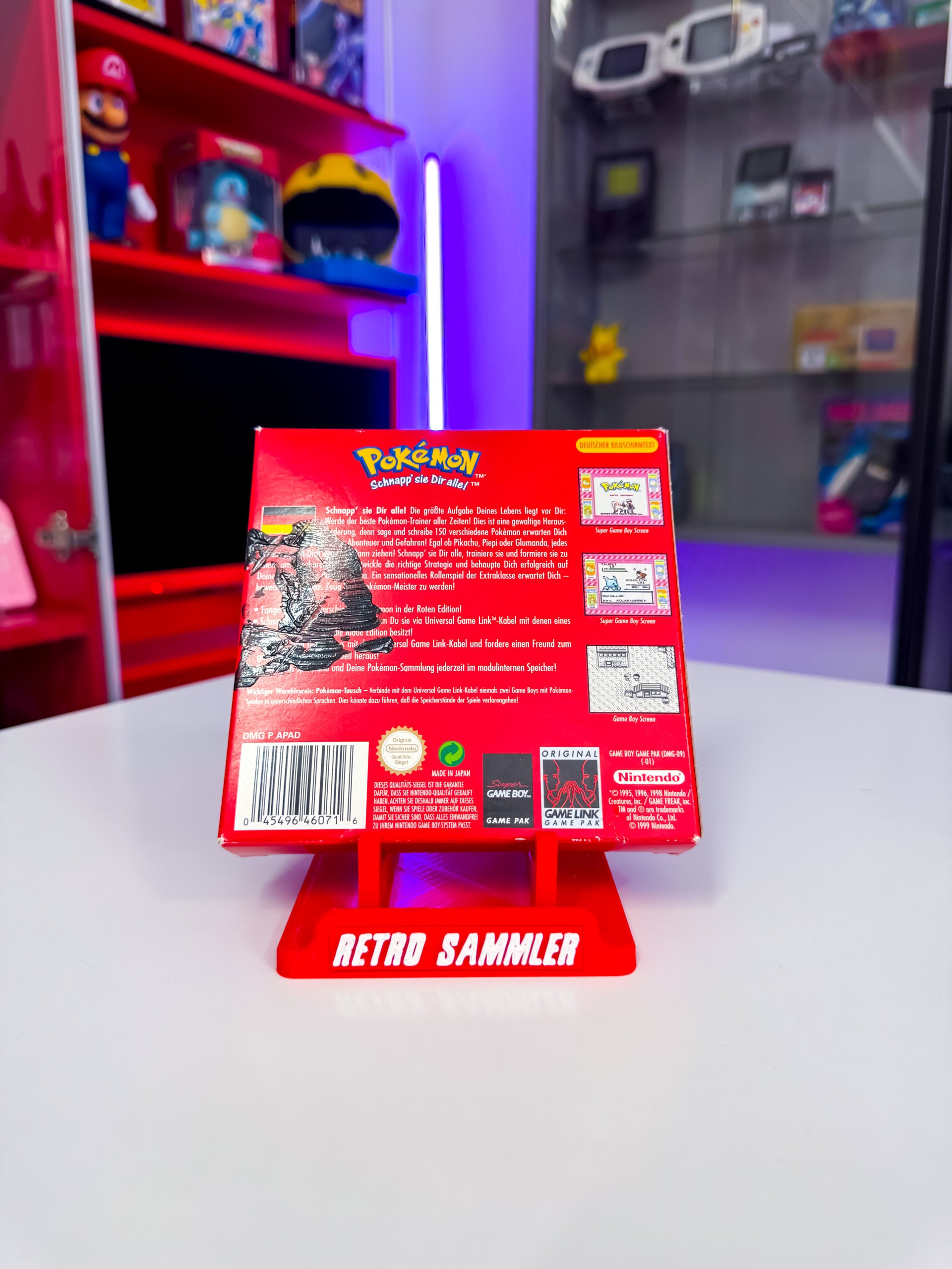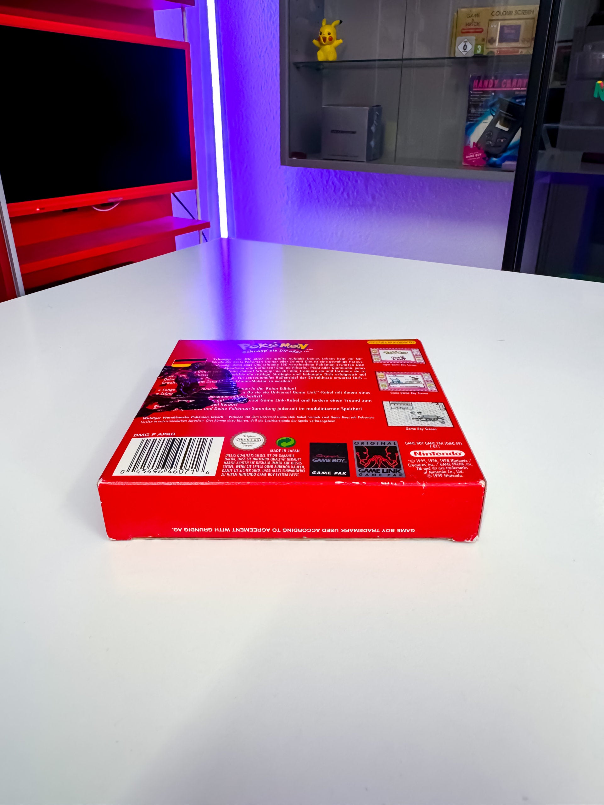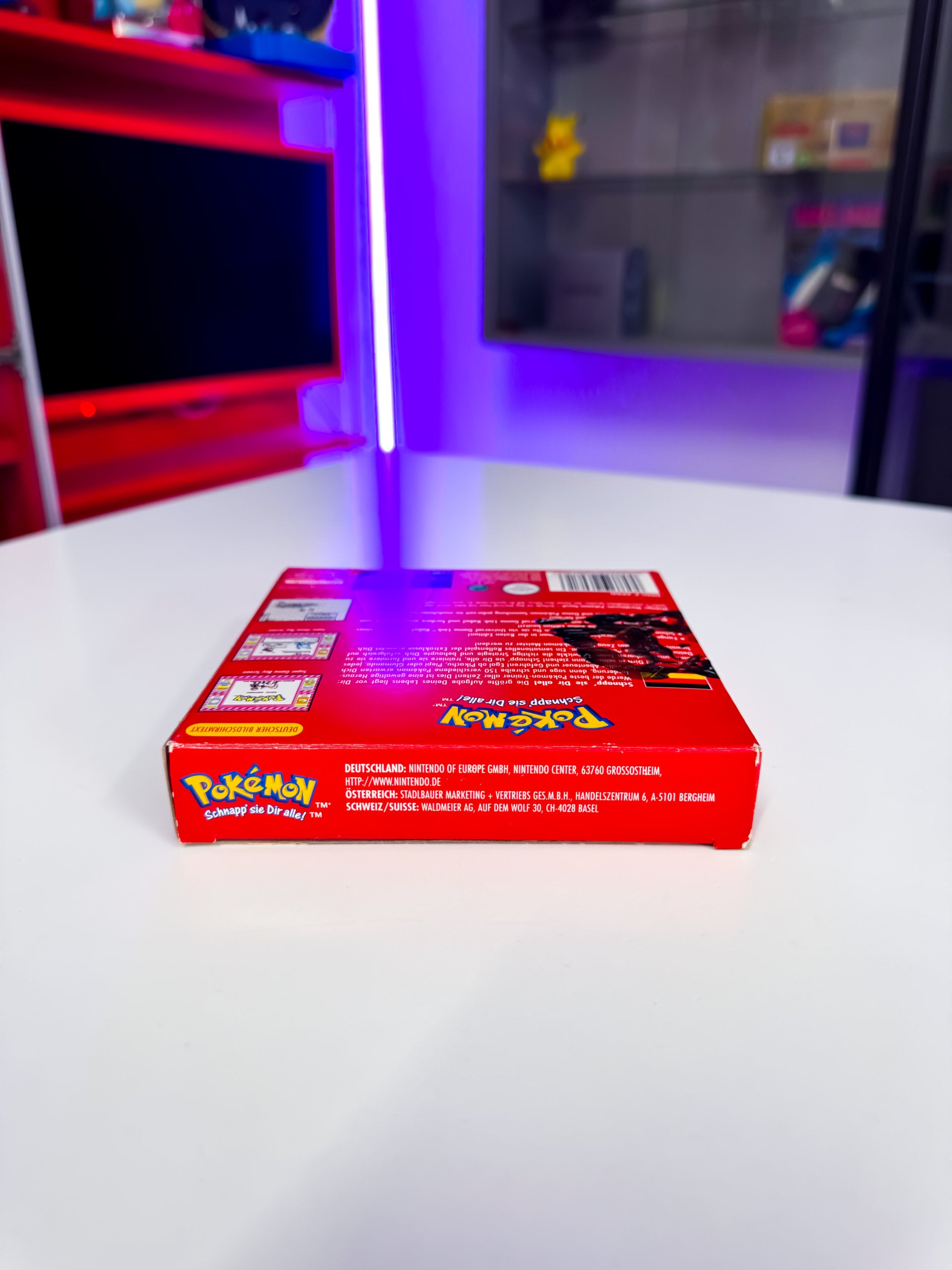 Die "Pokémon Rote Edition" für den Game Boy spielt in der Kanto-Region und ist das Originalspiel der ersten Generation, in dem du 151 Pokémon sammeln kannst, darunter das legendäre Mewtwo. Die Originalverpackung (OVP) zeigt Glurak auf dem Cover. Die Rückseite der OVP ist mit Fenstermalern bemalt, die du selbst entfernen kannst. Wir haben sie drauf gelassen, um die Verpackung nicht zu beschädigen.